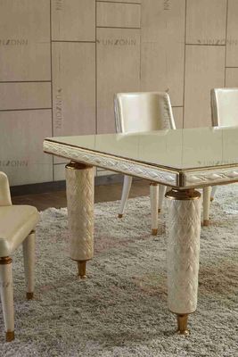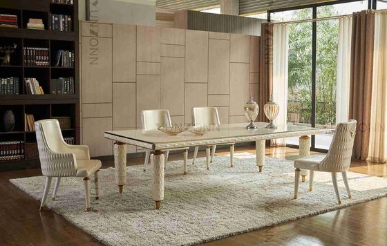 刺繍革カバー白のダイニング テーブルはガラス家のための上のステンレス鋼 フレームを和らげた