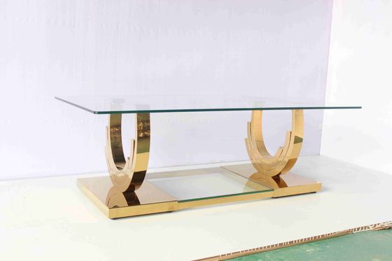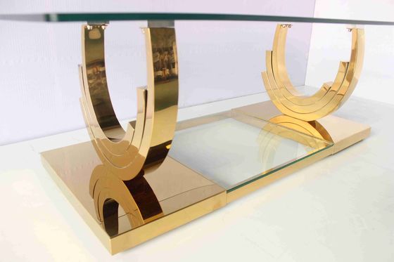 Yunzhangの家具はすべての顧客に現代および耐久プロダクトを製造するために捧げるアメリカ様式のU字型基盤のこのモデルは居間の使用法のために非常に適して、私達は真空のチタニウムの金を使用する従ってプロダクトは金を長い間照らし続けることができる。このコーヒー テーブルは項目を飾るために表示するように広く透明なガラス卓上の部分を自慢するあなたの居間のための完全な現代付属の部分である。金色で終えられて、テーブル フレームは安定性を加えるのに厚い管を使用する。