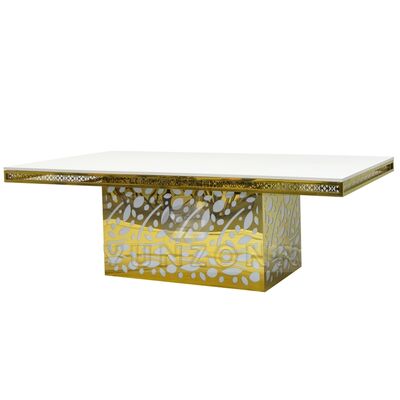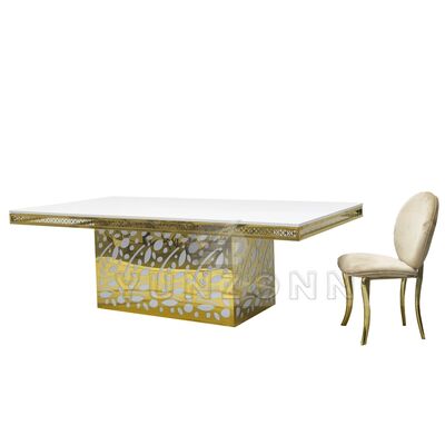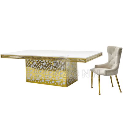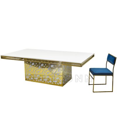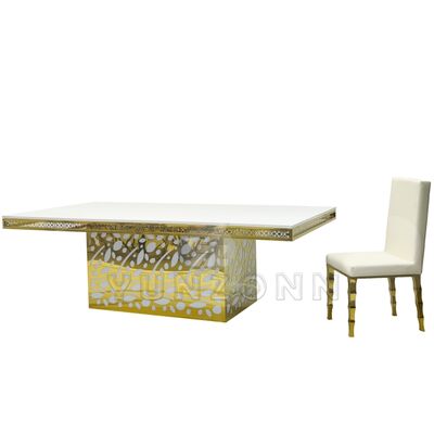 バンケット、レストラン、パーティー向けの高級ホテルステンレススチールクリスタルペンダントゴールデンガラスウェディング&イベントダイニングテーブル |